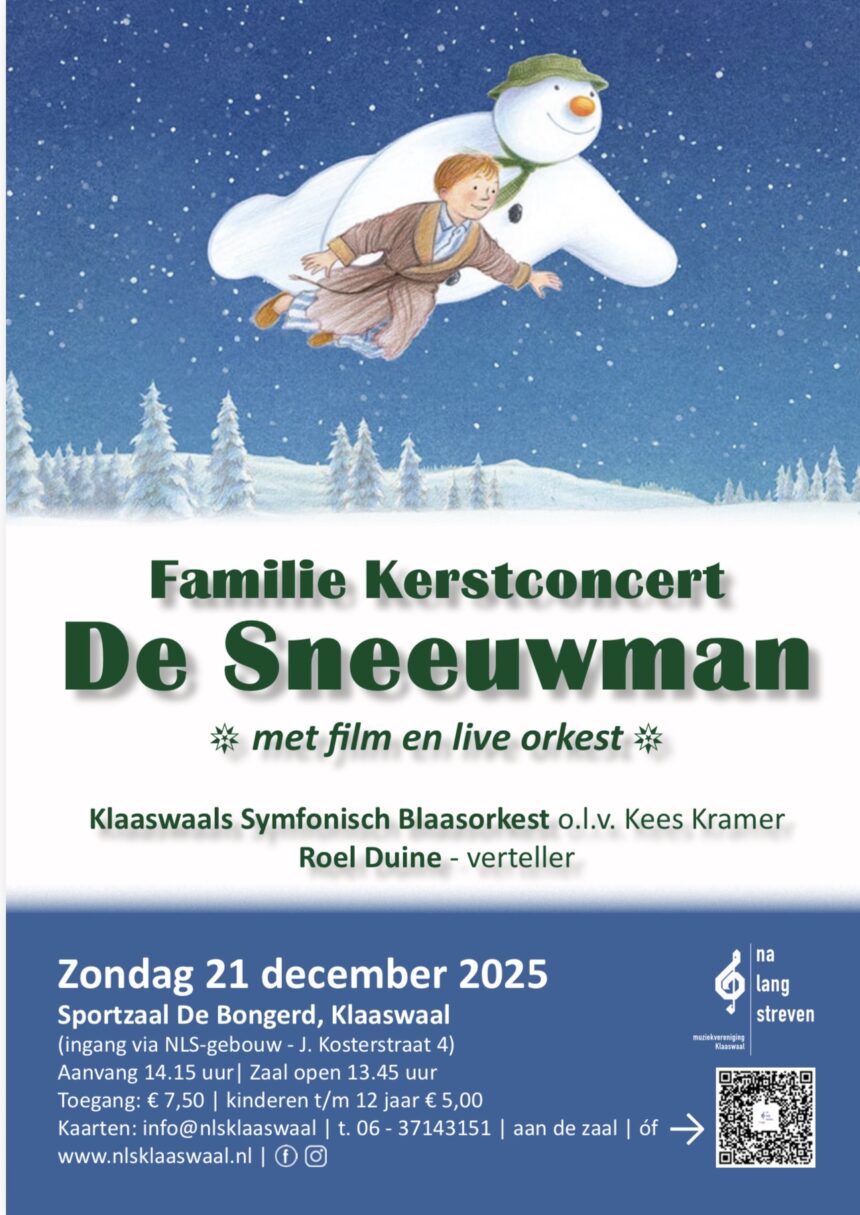 Op zondagmiddag 21 december presenteert het Klaaswaals Symfonisch Blaasorkest (KSB) van muziekvereniging Na Lang Streven een sfeervol familie kerstconcert in Sportzaal De Bongerd. Hoogtepunt van de middag is de geliefde animatiefilm…