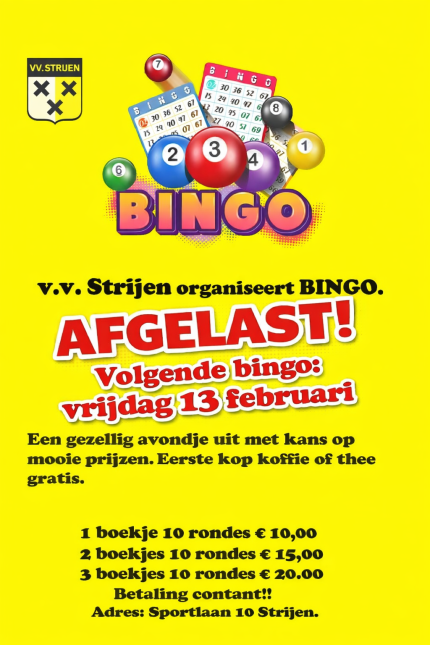 Strijen – De bingoavond die v.v. Strijen had gepland op vrijdag 9 januari 2026 gaat niet door. De organisatie heeft besloten de bingoavond te annuleren vanwege de winterse omstandigheden.
