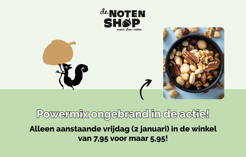 Ben jij dol op noten? Dan kan deze mix absoluut niet ontbreken! Deze vrijdag (2 januari) shop je de Powermix ongebrand 450 gram voor maar 5,95 in de winkel van…
