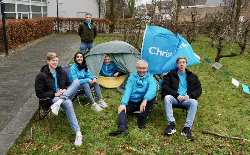 Met een knipoog zette de ChristenUnie Hoeksche Waard zaterdag een tent op voor het gemeentehuis in Oud-Beijerland.