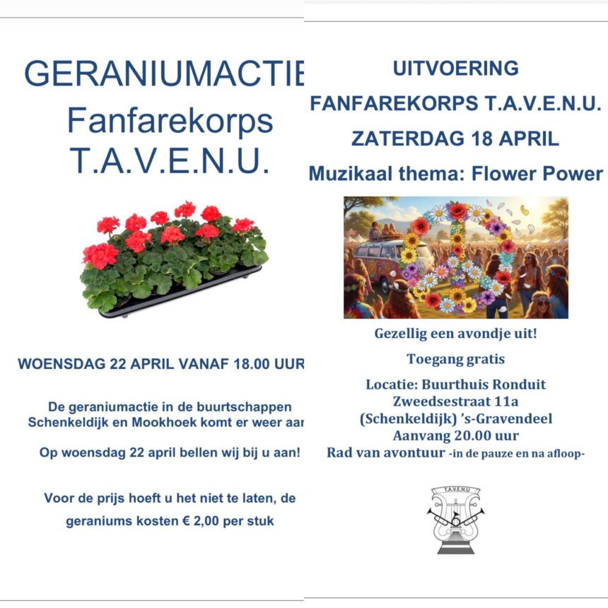 Geraniumactie en uitvoering Fanfarekorps T.A.V.E.N.U. in Schenkeldijk en ’s-Gravendeel