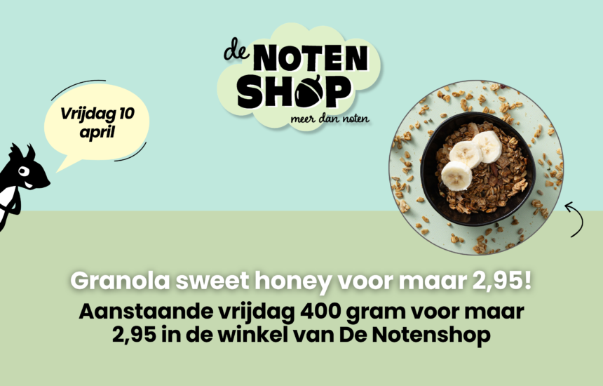 Vrijdag 10 april krijg je de granola sweet honey (400 gram) van 4,75 voor 2,95 in de winkel van De…