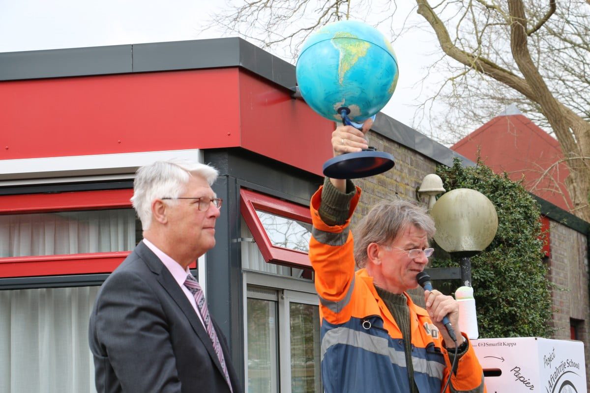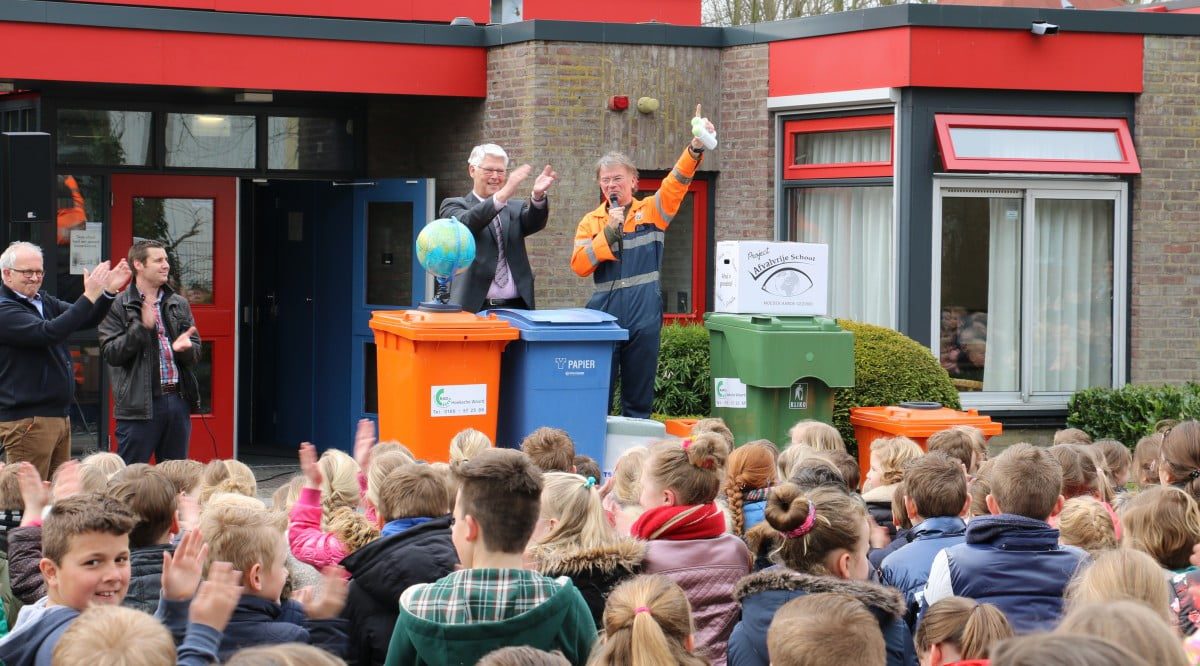 Enthousiast zijn de kinderen wanneer wethouder Piet van Leenen hen namens de burgemeester, de wethouders en de gemeenteraad een groot compliment geeft voor de inzet om de Eben-Haëzer tot een vrijwel volledig afvalvrije school te maken. Het is de bedoeling dat de school haar leerlingen bewust maakt dat door het goed scheiden van afval er zo min mogelijk restafval overblijft. “En dat is natuurlijk weer goed voor het milieu én de portemonnee. Een afvalvrije school levert de school een forse kostenbesparing op”. Het is duidelijk: Piet is niet alleen wethouder van openbaar gebied, maar ook van financiën! Het project Afvalvrije School sluit mooi aan bij Goed Scheiden Loont. Bewust omgaan met afval is niet alleen iets dat nu speelt, maar is juist gericht op de toekomst. Daarom is het belangrijk om bij de jeugd te beginnen.