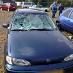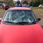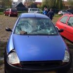 Bij drie voertuigen moest de voorruit eraan geloven en bij één voertuig ging de zitting achterin deels in vlammen op.
