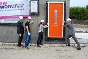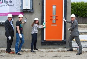 STRIJEN – Het was een feestelijke middag in de Strijense Oranjewijk, afgelopen dinsdag 10 mei. Daar werd met de officiële plaatsing van een betonnen binnenmuur voor één van de nieuw te bouwen woningen, de laatste fase gemarkeerd van de gehele herstructurering van de Oranjewijk. De wijk heeft de afgelopen vijf jaar een ware metamorfose ondergaan. Na de officiële handeling werden alle genodigden door HW Wonen uitgenodigd voor een hapje en een drankje en koffie met gebak in het gezellige dorpshuis ‘Streona’.