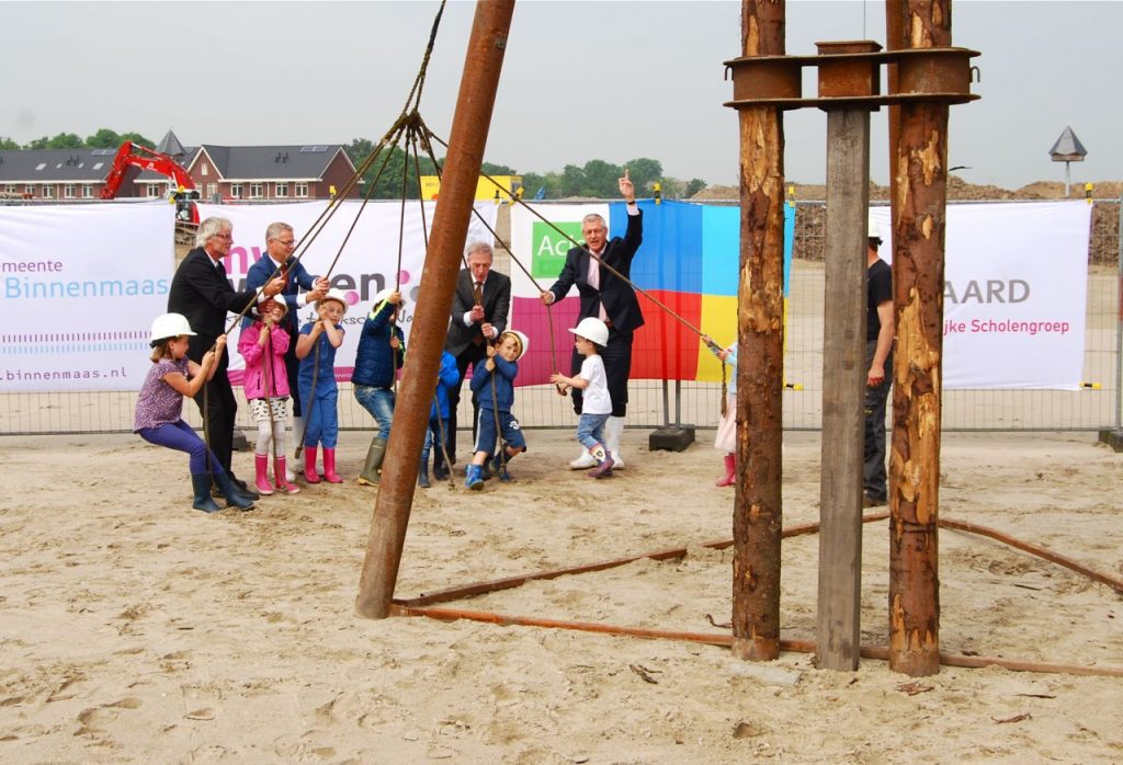 MIJNSHEERENLAND – Het was een feestelijke dag, afgelopen woensdag 1 juni in het centrum van Mijnsheerenland. In het Dorpshart ging de eerste officiële paal voor het multifunctionele centrum de grond in. Even na 11.00 uur zorgden wethouder Arie Mol, de directeur-bestuurders Luc van Heeren (ACIS), Bert Tuk (CSG De Waard) en Ben Pluimer (HW Wonen) er voor dat de eerste symbolische paal in de kleigrond verdween. Hierbij werden zij dapper geassisteerd door leerlingen van de beide basisscholen in het dorp.