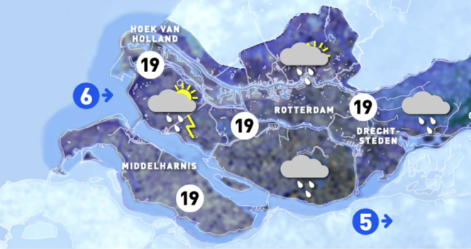 HOEKSCHE WAARD – Morgen zorgt een lagedrukgebied boven de Noordzee voor herfstachtig weer met buien, kans op onweer en windstoten en een lagere temperatuur. Er staat een (vrij) krachtig naar west draaiende wind, kracht 5 of 6.