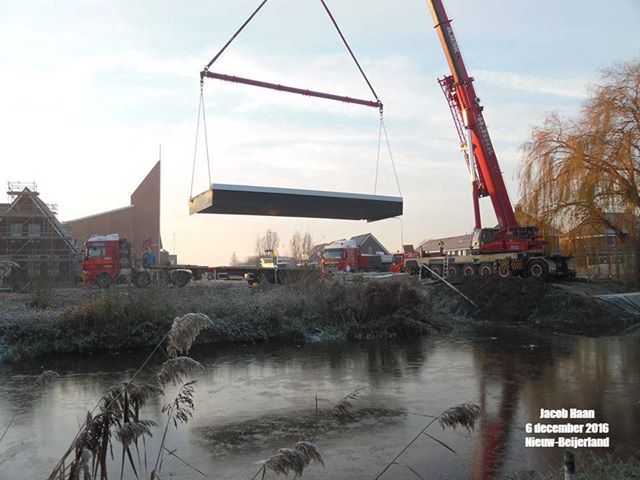 NIEUW-BEIJERLAND – De nieuwe brug over de Kreek is dinsdag 6 december 2016 op zijn plaats gelegd. Hij verbindt de nieuwe woonwijk aan de Kreek met de rest van het dorp. De brug werd in de nacht van 5 op 6 december naar Nieuw-Beijerland vervoerd per speciaal konvooi.