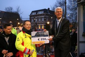 Nadat een aantal leden van de reddingsbrigades hun werk demonstreerden in het koude water van de haven, bedankte Piet van Leenen de deelnemers aan Serious Rescue voor hun belangeloze inzet en bijdrage en overhandigde namens het gemeentebestuur van Oud-Beijerland een cheque aan Sander Zeilstra (organisatie Serious Rescue). Met spanning keken de aanwezigen uit naar de tussenstand… deze bleek inmiddels (rond de klok van 5 uur) opgelopen tot zo’n 13.500 euro.
