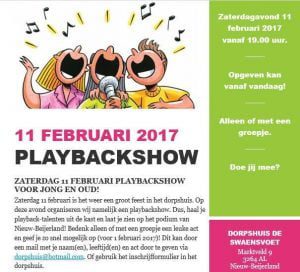 NIEUW-BEIJERLAND – Zaterdag 11 februari 2017 vanaf 19.00 uur is er een playbackshow in dorpshuis de Swaensvoet in Nieuw-Beijerland . Niemand minder dan Melissa Janssen (bekend van the voice of Holland & Carlo’s tv café) zal in de jury zitten.