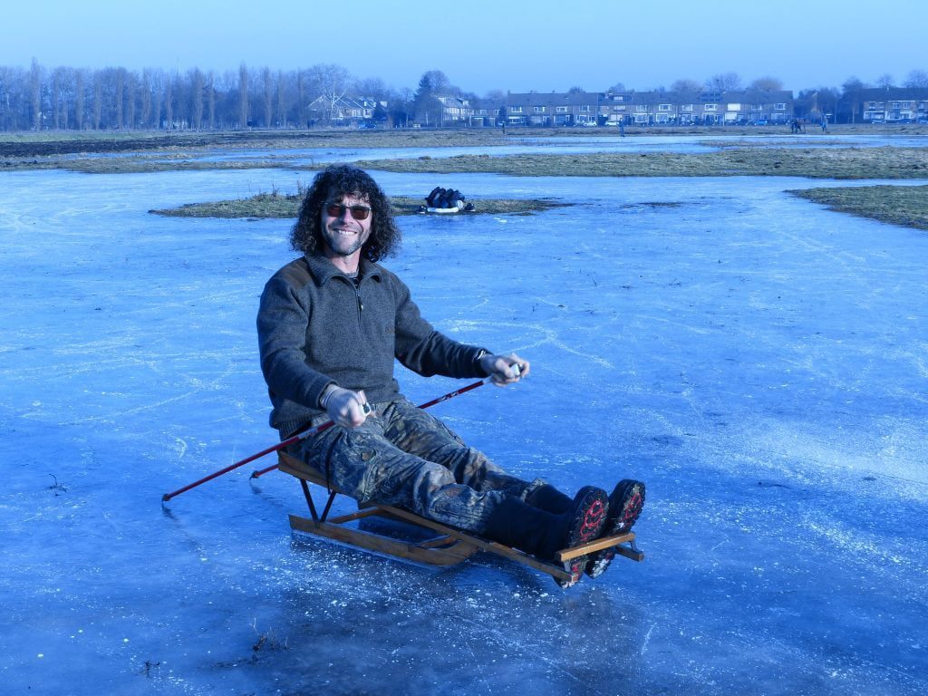 Ronald in ’t Veld op zijn zelfgebouwde Warmerhuizer prikslee die hij naar orginele tekening uit 1903 bouwde!