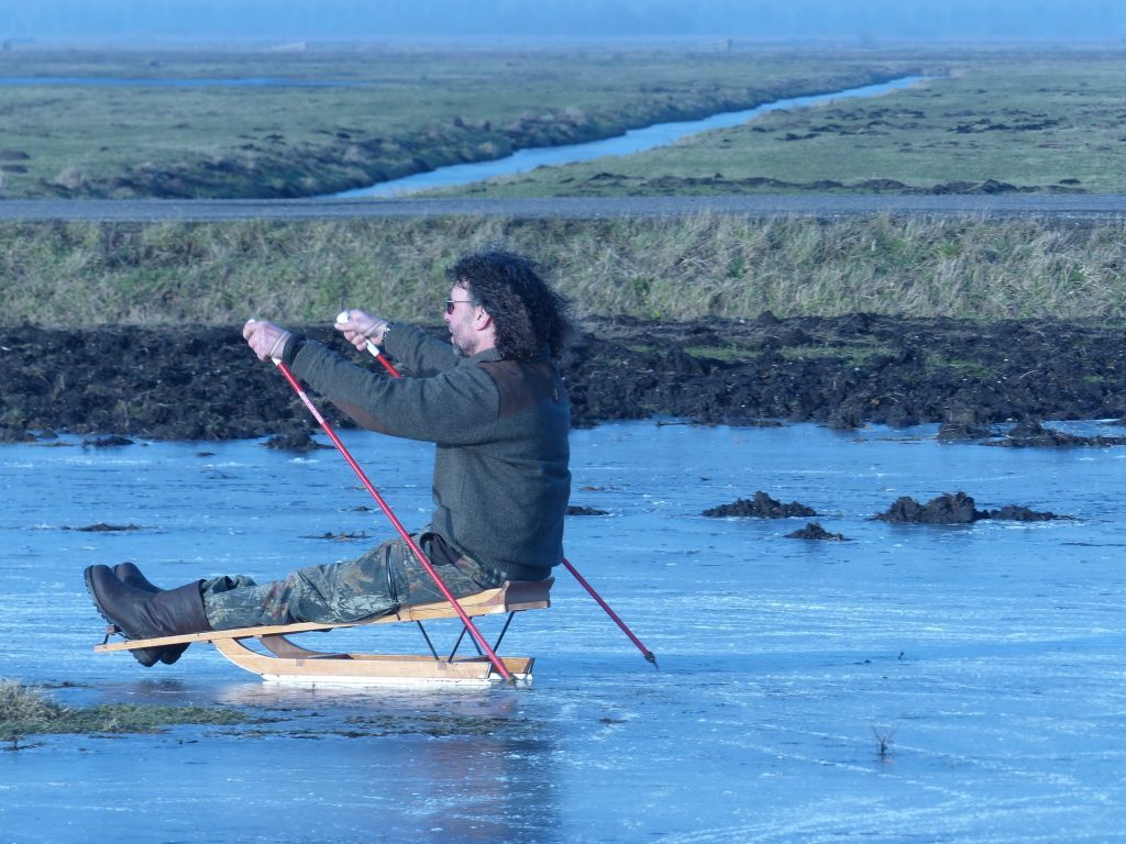 Strijen – Waar op veel plekken het ijs misschien nog wat onbetrouwbaar is, is dat zeker niet het geval op de bevroren plassen van het Oudeland van Strijen nabij de Bovenweg.