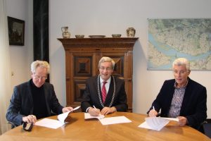 Burgemeester A.J Borgdorff, voorzitter G.P. van ’t Riet en penningmeester A.J. Karbaat van de Historische Vereniging ’s-Gravendeel zetten hun handtekening onder de overeenkomst. Hiermee is het zakelijk recht van opstal tot het hebben en houden van een verenigingsgebouw aan het Nestpad 6 in ’s-Gravendeel officieel geregeld.