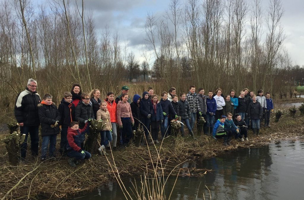 Puttershoek – Vrijdagochtend 24 februari hebben leerlingen van groep 8 van CBS De Schelp wilgen geknot in de Puttershoekse woonwijk ‘De Grienden’. Samen met directeur Helma Heesterman, wethouder Arie Mol van gemeente Binnenmaas en diverse ouders werden onder de deskundige leiding van Gaëlle Cagé van Hoekschewaards Landschap (HWL) maar liefst 90 wilgen geknot. Na afloop reikte wethouder Mol als blijk van waardering het certificaat “Griendwerker” uit aan de leerlingen.