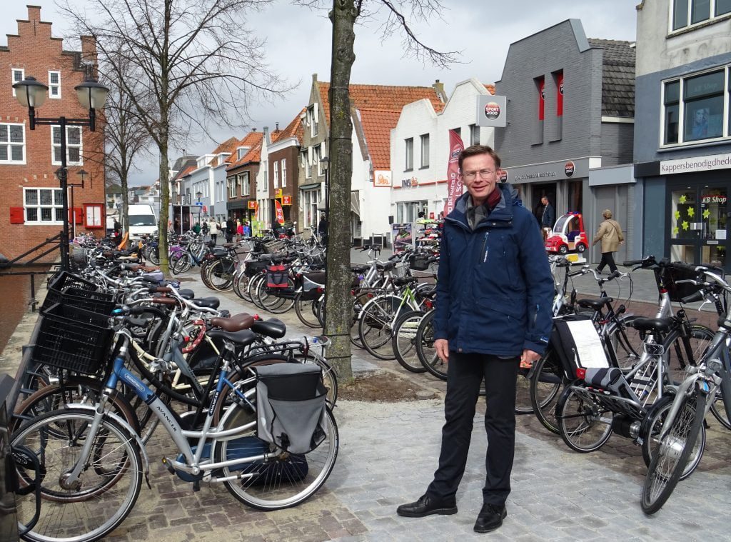 Tevreden neemt wethouder Harry van Waveren de ‘verkeerssituatie’ rond de nieuwe fietsenstalling in ogenschouw. De markt is zojuist van start gegaan en de vele fietsen staan keurig in gelid op gesteld. Leek de aanpak van het eerdere rommelige straatbeeld aanvankelijk op een ‘mission impossible’…de aanleg van een fraaie fietsstraat veranderde dit in ‘missie geslaagd’.