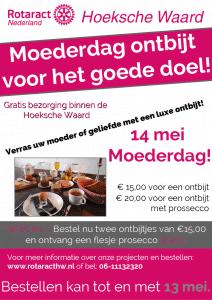 HOEKSCHE WAARD – Op 14 mei mogen we onze moeders extra in het zonnetje zetten. Rotaract Club Hoeksche Waard verzorgt ook dit jaar weer Moederdagontbijtjes voor het goede doel. Op zondagmorgen gaan zij vroeg uit de veren om de ontbijtjes samen te stellen en ze te bezorgen in de Hoeksche Waard aan uw moeder of geliefde.