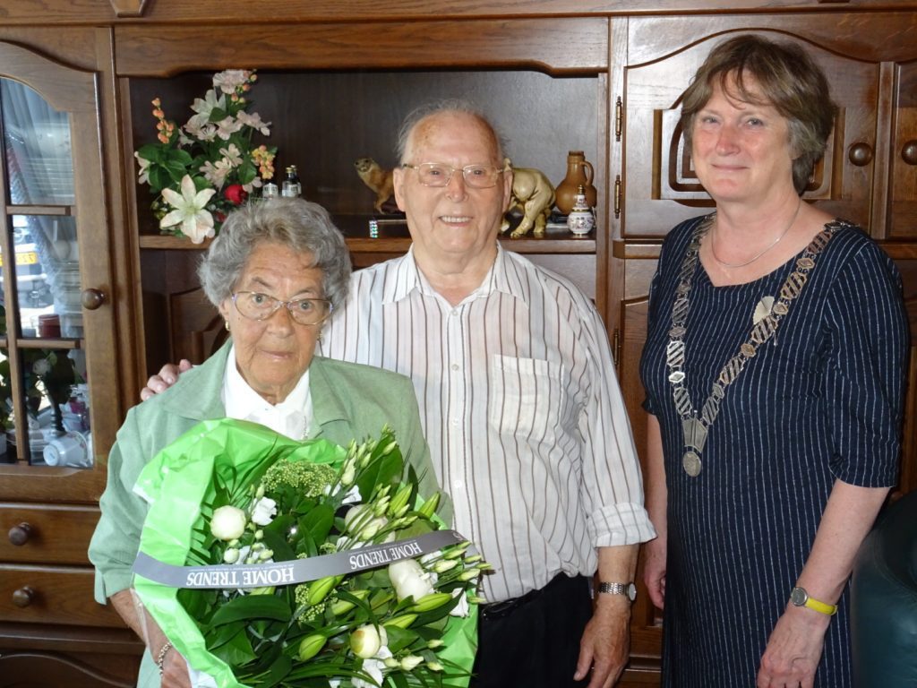 OUD-BEIJERLAND – Voor het Oud-Beijerlandse echtpaar Groeneweg was dinsdag 16 mei 2017 een feestelijke en gedenkwaardige dag… het was namelijk 60 jaar geleden dat de heer L. (Leen) Groeneweg (84) en mevrouw L.J. (Jannie) Groeneweg-Boer (84) hun jawoord gaven voor de ambtenaar van de burgerlijke stand. De bruidegom zag het levenslicht op 7 januari 1933 in Oud-Beijerland; daar stond ook de wieg van de bruid op 16 mei 1933. Burgemeester Jon Hermans-Vloedbeld bracht het diamanten bruidspaar woensdag 17 mei een felicitatiebezoek en overhandigde hen een boeket bloemen namens het gemeentebestuur.