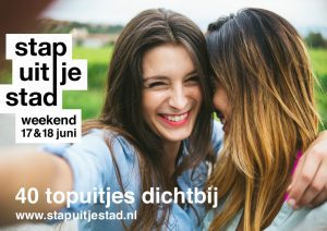 Andere meer recreatief: lopend, per (huur) ets, per uisterboot, waterbus of per eend (2CV) genieten van de prachtige omgeving en smullen van lokale heerlijkheden. Weer andere uitjes zijn cultureel: met kunstroutes en tochten langs historische gebouwen. Voor elke leeftijd is er iets te doen. Van niet duur tot gratis. In totaal zijn er 40 uitstapjes die je niet alleen een heel leuke tijd bieden, maar waardoor je ook je directe woonomgeving van haar mooiste kant leert kennen. Wie op 17 en 18 juni binnen blijft, doet zichzelf tekort! Dus Stap uit je Stad!