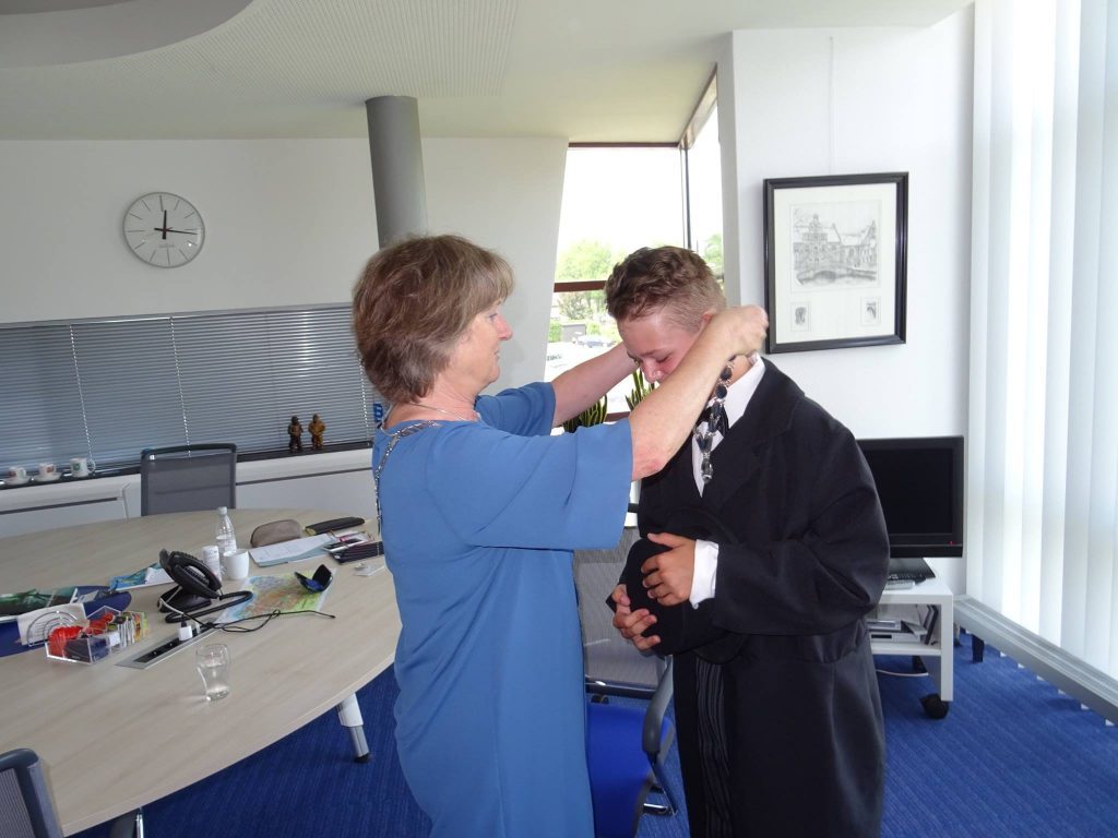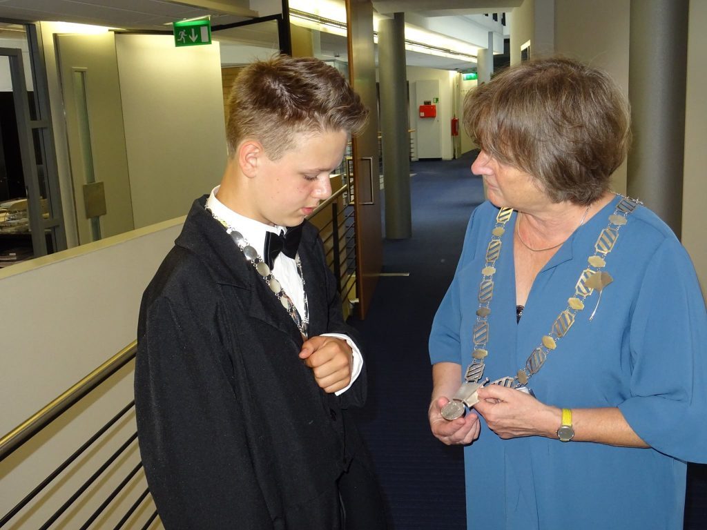 Een leuk verzoek, maar volgens de officiële regels mag een burgemeester zijn of haar ambtsketen niet uitlenen (behalve aan een vervanger). Gelukkig zorgde de burgemeester voor een ander (nep)exemplaar. Vanmiddag overhandigde ze de ambtsketen aan Luka. Het staat hem goed, toch?