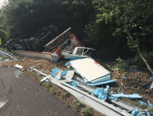 Regio – Op de A29 bij knooppunt Sabina is zaterdagmiddag 8 juli een vrachtwagen geladen met aardappelen van de weg geraakt.