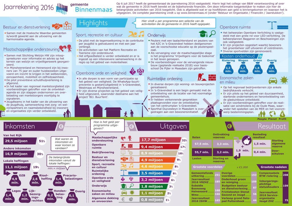 Om de informatie voor u toegankelijker te maken, is de jaarrekening samengevat in de infographic onder dit bericht. In deze infographic zijn de hoogtepunten van de jaarrekening in illustraties weergegeven. U kunt per beleidsterrein zien wat de belangrijkste onderwerpen in 2016 waren.