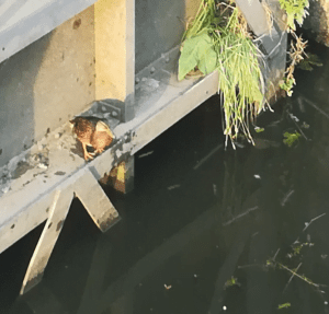 Als de EEND in de rui is (ruilen van het verendek) kan ze niet vliegen of ze bouwt een nest in de sluisdeur, zie foto? Uitgaande dat de EEND in de rui is komt ze nooit de sluis uit als er geen boot doorheen gaat. Daarom werd vanavond 1 sluisdeur opengezet voor deze EEND. We zullen zien of de EEND er gebruik van maakt?