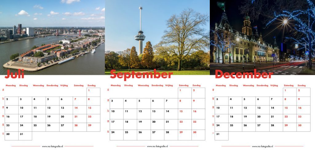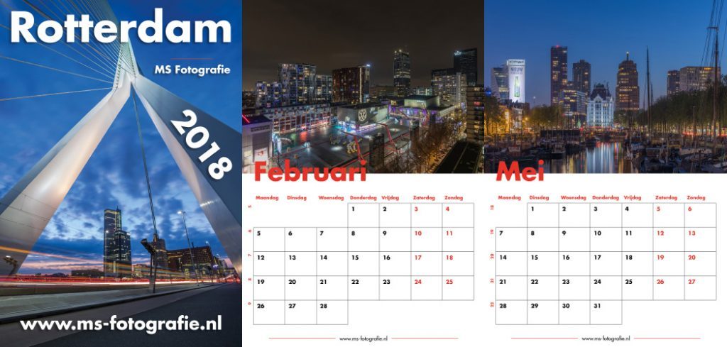 STRIJEN – Na het grote succes van vorige jaar zal MS Fotografie ook dit jaar weer met een nieuwe Rotterdam 2018 kalender komen. De afgelopen weken is er samen met professioneel stadsfotograaf Marc van der Stelt hard gewerkt om de kalender nog specialer te maken dan vorig jaar.De wandkalender met 13 schitterende foto’s van Rotterdam is wederom te gebruiken als jaar- en/of notitiekalender door middel van de ruime vakken per dag. Het formaat is net iets groter dan A4 (21,8cm x 32,0cm). Alle pagina’s zijn gedrukt op 300 grams silk MC papier waardoor de kleuren perfect naar voren komen.