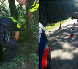 Om uit te zoeken waar het hier om ging kwamen de Politie er niet onderuit om de zakken te openen.De lucht trotserend en met de nodige beschermingsmiddelen waanden de agenten zich een weg door de struiken.