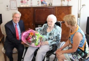 Burgemeester Borgdorff en zijn echtgenote bezochten mevrouw Vos en brachten onder overhandiging van een boeket bloemen de felicitaties over namens het gemeentebestuur.