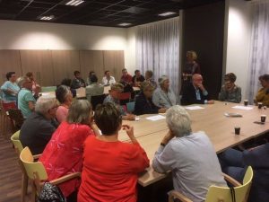Ad Verhagen, horecamanager bij Zorgwaard, vertelde over de veranderingen in de maaltijdvoorziening door de jaren heen. Er is en de loop der jaren veel veranderd in onze smaakvoorkeuren. Vonden we vroeger een aardappeltje met boontjes en sukadelapjes een waar feest, tegenwoordig kiest men steeds vaker voor gerechten uit andere culturen, al blijft de Hollandse pot toch ook favoriet. De wereldse gerechten konden worden geproefd en vielen zeker in de smaak. Ook kon er geproefd worden van diverse gemalen producten, zoals een gemalen broodje kroket, een sprits, maar ook bier en wijn dat van structuur is veranderd, zodat dit niet opgedronken maar opgelepeld kan worden. Voor mensen met slikproblemen een uitkomst om toch te kunnen blijven genieten van lekker eten en drinken. Het was een succes en zeker voor herhaling vatbaar. En dat gaan we doen!