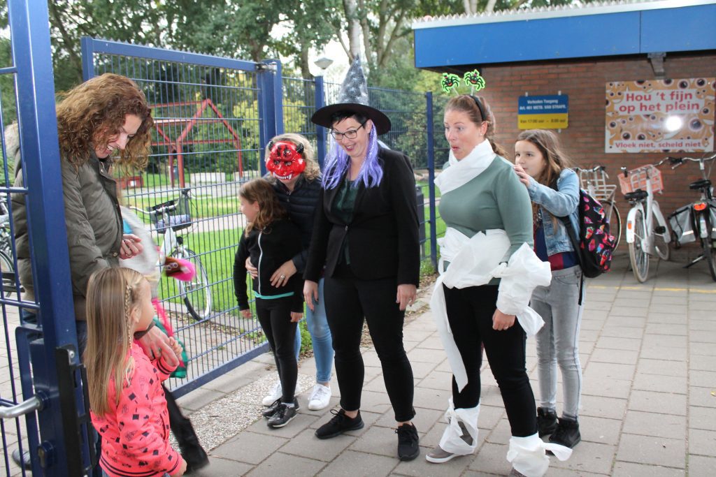 Woensdag 4 oktober werden de kinderen bij de ingangen van de school op een griezelige manier onthaald. Op de achtergrond klonk het lied van de kinderboekenweek, gezongen door Kinderen voor Kinderen. De kleuters griezelden bij ‘Gruffalo-juffen’ bij hun ingang en de oudere kinderen zagen nog griezeligere juffen en meesters.