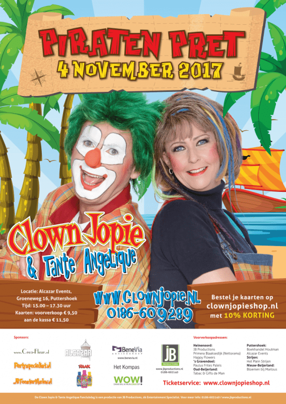 PUTTERSHOEK – Clown Jopie & Tante Angelique gaan hun 20e fanclubdag vieren met de show “Piraten Pret”. Op zaterdag 04 november is de Clown Jopie & Tante Angelique kindershow in Alcazar Events te Puttershoek. Parkeren is geen enkel probleem en bovendien gratis. Vanaf 15:00 uur barst het feest los in Alcazar Events.
