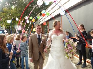 Peter, in het dagelijks leven eigenaar van een auto bedrijf in Strijen, begeleidde zijn bruid na de ceremonie in het gemeentehuis van Binnenmaas naar cbs De Bouwsteen in ‘s-Gravendeel. Daar is Karen al heel wat jaartjes werkzaam als lieve juf, dit jaar in groep 6.