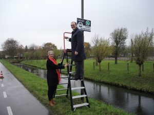NIEUWENDIJK – Op initiatief van een aantal inwoners van de buurtschap Nieuwendijk is in samenwerking met de buurtvereniging op maandag 20 november door burgemeester Stoop en mevrouw Stolk, in het bijzijn van een aantal buurtbewoners het eerste WhatsApp Buurtpreventiebordje opgehangen aan de lichtmast aan de Nieuwendijk.