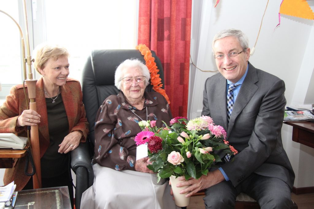Burgemeester Borgdorff en zijn echtgenote bezochten mevrouw van Zanen vandaag en brachten onder overhandiging van een boeket bloemen de felicitaties over namens het gemeentebestuur.