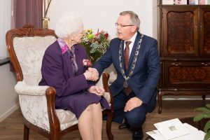 Burgemeester Luteijn en zijn echtgenote gingen vanochtend op de koffie bij mw. Speelman om haar te feliciteren met deze wel heel bijzondere leeftijd.