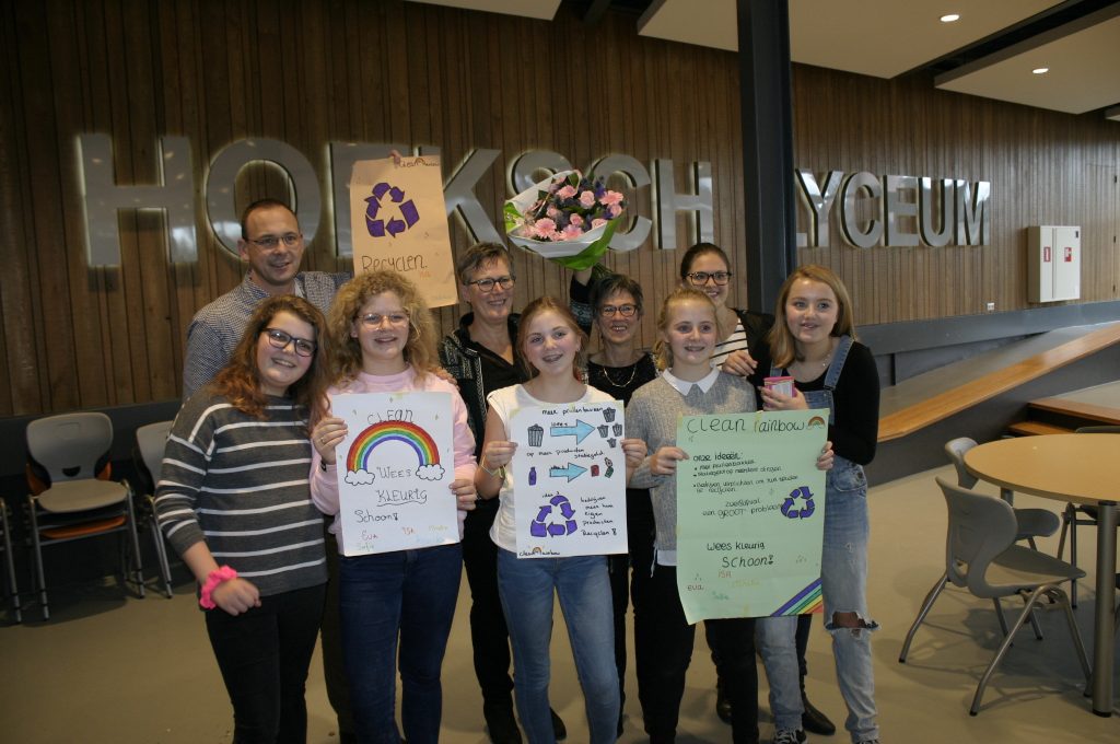 Het adviesgroepje dat zichzelf ‘Clean Rainbow’ had gedoopt, vergaarde de meeste punten en was daarmee de winnaar. Eva, Sofie, Isa, Annika en Mischa zitten in klas MH1a en ontwierpen een fleurige regenboog met de slogan ‘Wees kleurig schoon!’. Ze hadden hun kraam leuk ingericht en goed nagedacht over de onderzoeksvragen. Volgens de vijf meiden helpt statiegeld op blikjes en kleine flesjes het tegengaan van zwerfafval. Ook willen ze bedrijven verplichten hun verpakkingen terug te nemen.