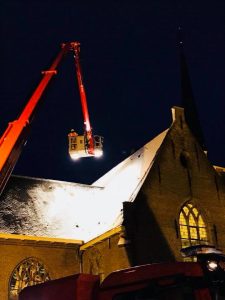 De melding was gedaan door de beheerder/koster van de Dorpskerk in centrum Oud-Beijerland. Door de hevige sneeuwval en de daaropvolgende regen waren de goten van de kerk verstopt/overvol geraakt waardoor het water via, en op verschillende plaatsen de kerk binnenkwam stromen.