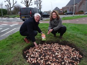 OUD-BEIJERLAND – Maandag 18 december 2017 zijn drieduizend tulpenbollen ter aarde besteld bij de Rembrandtrotonde aan de Langeweg. De bollen zijn een geschenk van Rotaryclub Hoeksche Waard-Binnenmaas. Na de voorbereidende werkzaamheden door de mannen van de buitendienst werd een aantal bollen geplant door wethouder Piet van Leenen en voorzitter van de Rotaryclub Irene van Bentum.