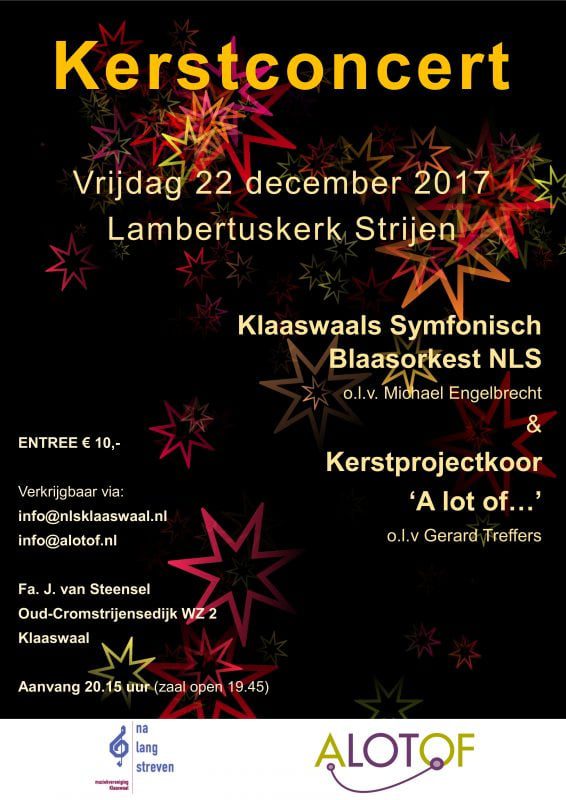 STRIJEN – Het Klaaswaals Symfonisch Blaasorkest en het grote projectkoor “A Lot Of…” verzorgen vrijdag 22 december een bijzonder kerstconcert in de Lambertuskerk in Strijen. In een sfeervolle ambiance genieten bezoekers van mooie, aan Kerstmis gerelateerde muziek uit alle windstreken. Een prachtig begin van het kerstweekend!