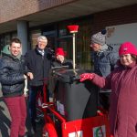 Ze laten zich de taart dan ook goed smaken! Maar dan breekt toch echt het moment aan om, gewapend met muts, sjaal en warme jas naar buiten te gaan. Daar wacht namelijk een gloednieuwe bakfiets, voorzien van een container, bezem en grijper. Beschikbaar gesteld door gemeente Oud-Beijerland en Regionale Afvalstoffendienst Hoeksche Waard.