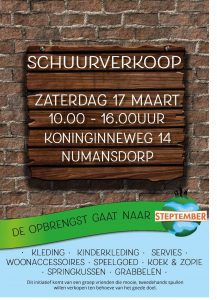 NUMANSDORP – Het voorjaar de periode waarin veel mensen weer aan de slag gaan met het opruimen en klaarmaken van hun huis en tuin voor de lente en de zomer. Zo kreeg ook een vriendengroep uit Numansdorp de opruimkriebels. Samen bedachten ze dat ze met de spullen die zij niet meer nodig hebben ook iets goed konden doen. Zaterdag 17 maart van 10.00 – 16.00 uur houden zij een schuurverkoop voor het goede doel, Steptember, op Koninginneweg 14 in Numansdorp. De opbrengst 17 maart gaat naar Steptember, een goed doel dat geld ophaalt voor kinderen met Cerebrale parese (CP).