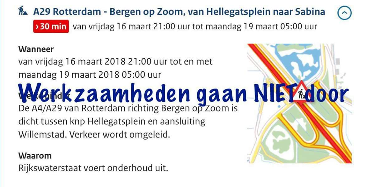 De werkzaamheden van 16 tot 19 maart op de #A29 knooppunt #Hellegatsplein ➡️ knooppunt #Sabina zijn gecanceld vanwege de aankomende weersomstandigheden.