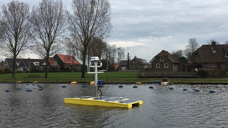 De waterdrone is uitgerust met zonnepalen en vaart volledig elektrisch. Het is een opvallende verschijning. “Ja het is zeker een bijzonder ding”, vertelt heemraad Lies Struik enthousiast. “Hij kan tot wel 4 meter diep de bodem doorzoeken. Al is dat hier niet eens nodig, want zo diep baggeren we niet.”