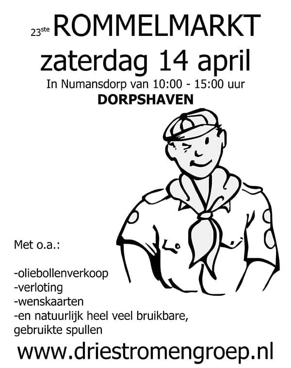 NUMANSDORP – Op zaterdag 14 april vindt de jaarlijkse Rommelmarkt plaats van scouting Driestromengroep. De Rommelmarkt is van 10:00 uur tot 15:00 uur bij de Dorpshaven in Numansdorp.