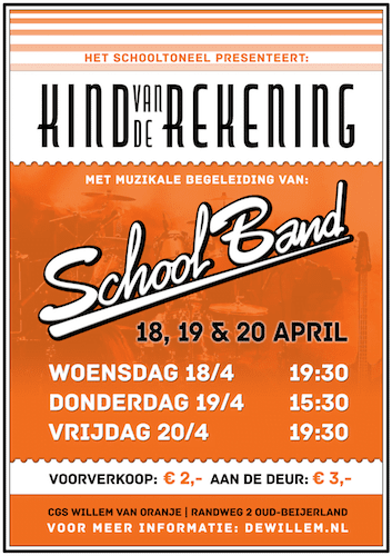 OUD-BEIJERLAND – De jaarlijkse toneel- en muziekuitvoering op CSG Willem van Oranje staat weer voor de deur. Van woensdag 18 t/m vrijdag 20 april wordt de voorstelling ‘Kind van de rekening’ opgevoerd. De toneelscènes worden afgewisseld met toepasselijke nummers van de schoolband.