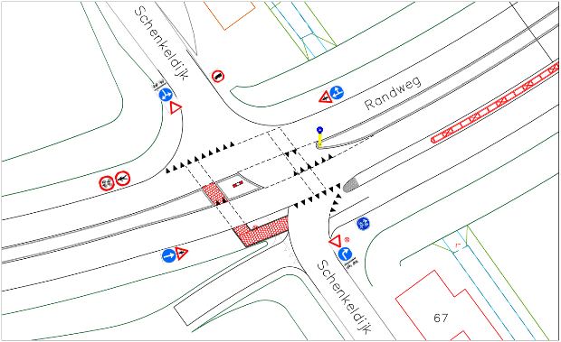 Op dit moment kan gemotoriseerd verkeer komende vanaf de Schenkeldijk (noordzijde) alleen rechtsaf slaan de Randweg op, richting de rotonde Randweg – Strienemonde. Na de aanpassing van de kruising, kan het verkeer ook linksaf de Randweg op, in de richting van de Schelpweg.