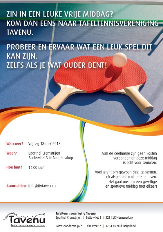 NUMANSDORP – Op vrijdag 18 mei organiseert TTV Tavenu van 14:00 – 15:30 uur een tafeltennismiddag voor senioren in Sporthal Cromstrijen te Numansdorp.