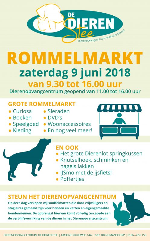 NUMANSDORP – Op zaterdag 9 juni 2018 organiseert Dierenopvangcentrum De Dierenstee weer haar jaarlijkse rommelmarkt. Op het terrein van de opvang wordt net als voorgaande jaren een divers aanbod aan tweedehands spullen aangeboden; van boeken tot woonaccessoires en van speelgoed tot kleding.