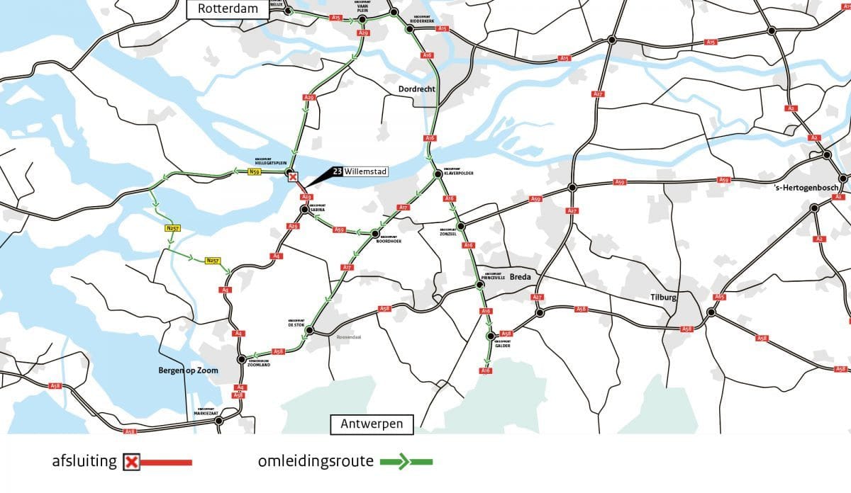 De tussenliggende op- en afrit Willemstad (23) is eveneens afgesloten. Weggebruikers dienen door omleidingen rekening te houden met extra reistijd die kan oplopen tot 20 minuten.